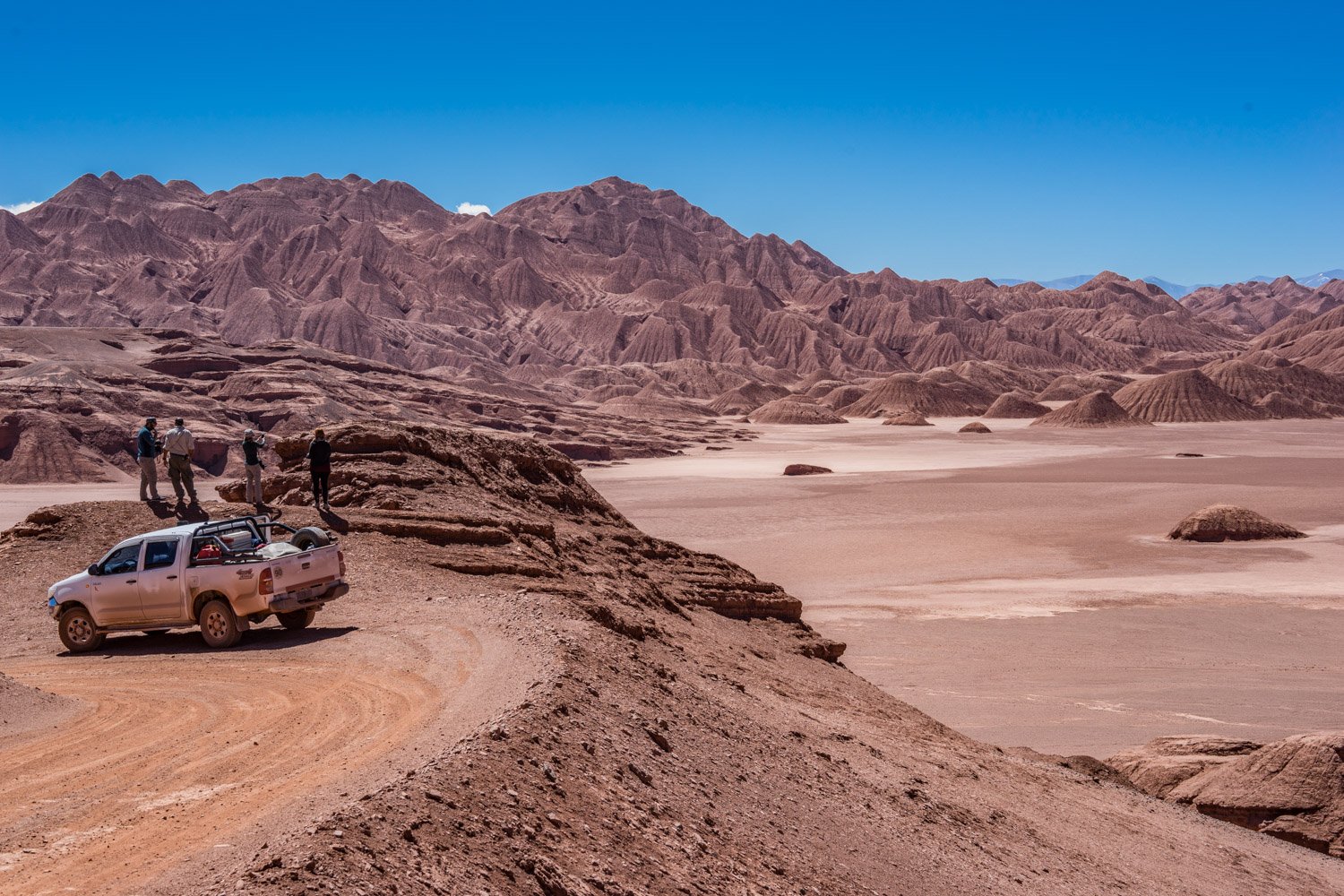 After lunch in San Antonio de los Cobres, we take Route 40 to the north and after about an hour reach Salinas Grandes in Jujuy province where we visit the other-worldly salt flats. Bring sunglasses for this spectacular glistening of the salar located 3350m above sea level. A lake that dried up in the Holocene, this is now a 525sq km crust of salt up to half-a-meter thick. On a clear day, the blinding contrast between bright blue sky and the cracked and crusty expanse of white is spellbinding. Then we descend the impressive Cuesta de Lipan, reaching the maximum height of the trip: 4,170 meters to lead to Purmamarca on the evening, framed by the Seven Colour Hill.